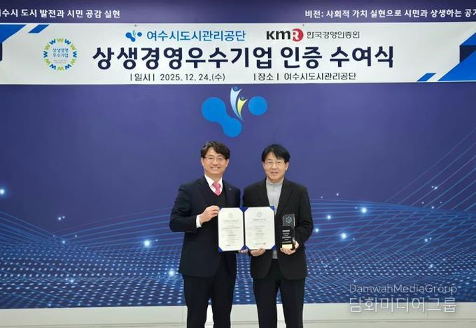 시민행정신문 강갑수 기자 | 여수시도시관리공단은 상생경영 실천 성과를 인정받아 한국경영인증원으로부터 ‘상생경영 우수기업’ 인증을 2년 연속 획득했다고 24일 밝혔다.