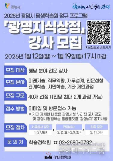 시민행정신문 강갑수 기자 | 광명시 평생학습원이 시민 맞춤형 평생학습 프로그램 ‘광명지식상점’을 운영할 2026년도 전문 교육 강사를 공개 모집한다.