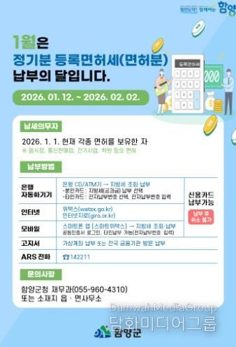군 관계자는 “기한 내 납부하지 않으면 가산금 부담 및 면허 정지 등 불이익을 받을 수 있으므로 납부 마감일인 2월 2일까지 꼭 납부해 주시길 바란다”라고 당부했다.