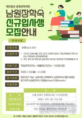한편, 남원장학숙은 올해 대대적인 시설 개선 사업을 통해 입사생들의 생활 환경을 전면 개선할 계획이다.