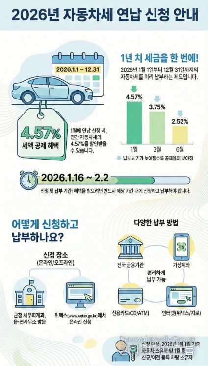 자동차세는 매년 6월과 12월 두 차례 부과되는데, 1월에 연납하면 연세액의 4.57%를 공제받을 수 있다.