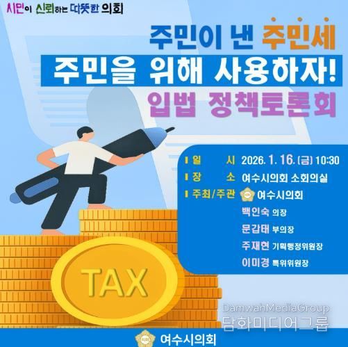 시민행정신문 강갑수 기자 | 여수시의회는 오는 1월 16일 오전 10시 30분, 여수시의회 소회의실에서 '주민이 낸 주민세, 주민을 위해 사용하자' 입법 정책토론회를 개최한다.