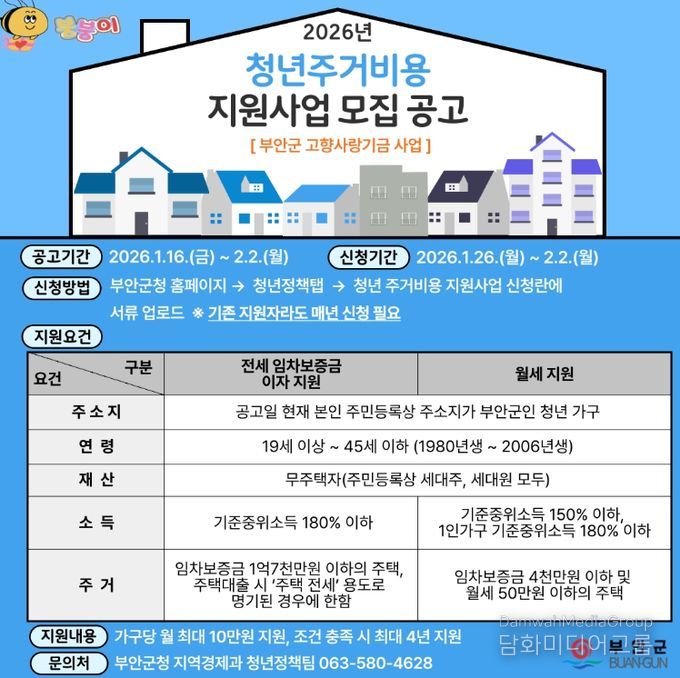 시민행정신문 강갑수 기자 | 부안군은 고향을 응원하는 소중한 마음이 담긴 고향사랑기부금을 활용해 관내 청년들의 주거 안정을 돕는 2026년 청년 주거비용 지원사업 신청자를 오는 26일부터 2월 2일까지 모집한다고 밝혔다.