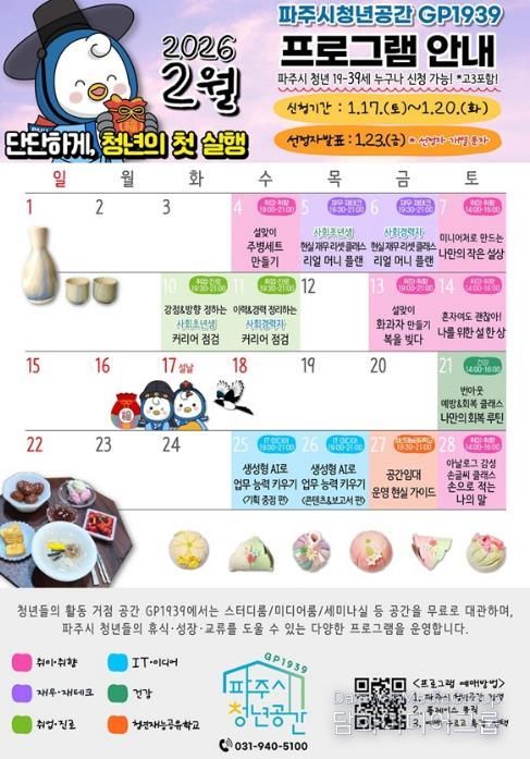 시민행정신문 강갑수 기자 | 파주시청년공간 지피(GP)1939가 오는 2월 한 달간 청년을 위한 맞춤형 프로그램에 참여할 참여자를 모집한다.