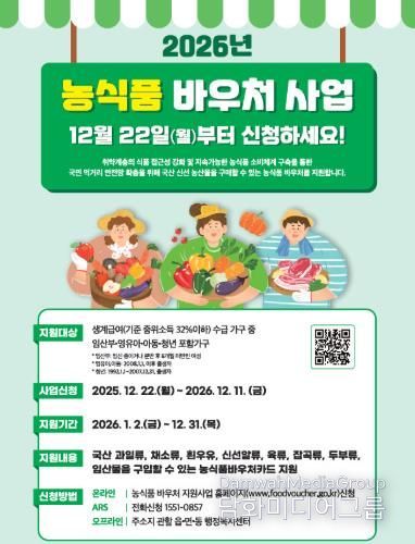 박은석 무주군농업기술센터 농촌활력과장은 "농식품 바우처는 취약 계층 군민들이 신선하고 균형 잡힌 농식품을 섭취할 수 있도록 뒷받침하는 정책“이라며 ”소급 지원이 되지 않는 만큼 대상 가구들이 꼭 신청해서 혜택을 누릴 수 있도록 홍보에도 최선을 다할 것“이라고 밝혔다.