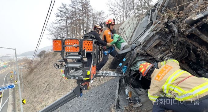 이번 사고는 석탄재를 적재한 덤프트럭이 가드레일을 출동한 뒤 전복된 것으로 확인됐으며, 신고 접수 직후 홍성소방서는 즉시 현장 출동을 했다.