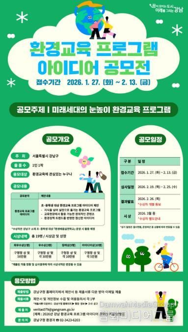 시민행정신문 강갑수 기자 | 꿈이 모이는 도시, 미래를 그리는 강남구가 학교 현장에서 바로 활용할 수 있는 환경교육 콘텐츠를 발굴하기 위해 ‘2026년 강남 환경교육 프로그램 공모전’을 1월 27일부터 2월 13일까지 진행한다.