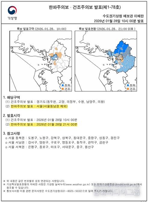 28일 밤 9시를 기점으로 서울 동남권을 제외한 3개 권역(동북권·서남권·서북권)에 한파주의보가 발효됨에 따라, 서울시는 한파 종합지원상황실을 가동하고 자치구 및 유관기관과 협력해 시민 보호와 취약시설 안전관리를 강화한다고 밝혔다.