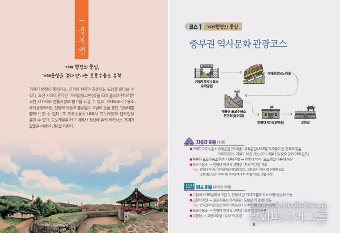 ‘관광코스’ 편에서는 거제를 권역별로 구분해 역사와 문화가 어우러진 관광 동선을 제안하고, 코스별 이동 경로와 주요 관광지에 대한 설명을 함께 담아 개별 여행객은 물론 가족 단위 관광객도 거제의 역사 관광을 효율적으로 즐길 수 있도록 했다.