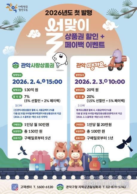 시민행정신문 강갑수 기자 | 관악구가 2026년 새해를 맞아 위축된 지역 소비를 촉진하고 민생경제에 활력을 불어넣기 위해 ‘관악땡겨요상품권’과 ‘관악사랑상품권’의 발행을 시작한다.