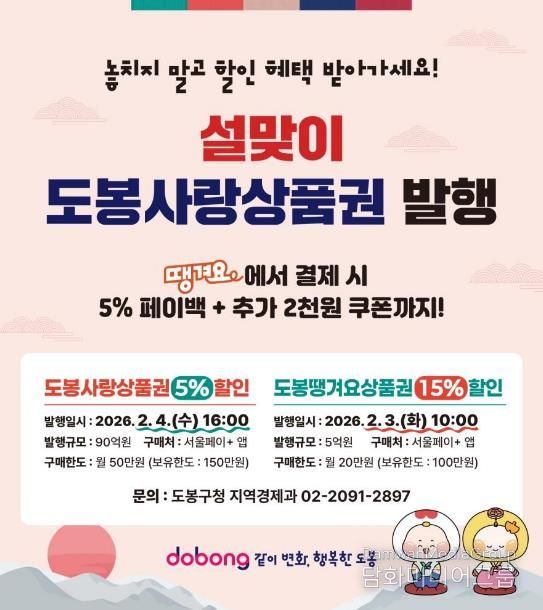 시민행정신문 강갑수 기자 | 서울 도봉구가 민족 대명절 설을 맞아 90억 원 규모의 도봉사랑상품권과 5억 원 규모의 도봉땡겨요상품권을 발행한다.
