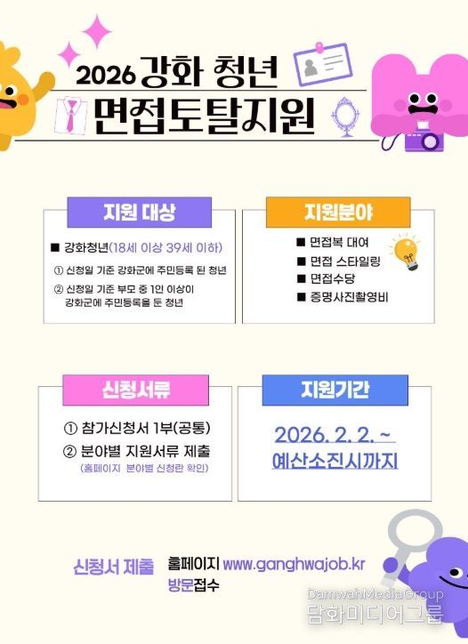 '강화 청년 면접 지원-면접 토탈 솔루션'은 2026년 취업을 준비하는 강화 청년들에게 취업 준비에 따른 비용 부담과 스트레스를 덜어주기 위해 추진됐으며, ▲증명사진 촬영비 지원 ▲면접복 대여 ▲면접 스타일링 ▲면접 수당 지원 ▲AI 자기소개서 · 면접 체험 등 다양한 프로그램으로 청년들을 맞이한다.