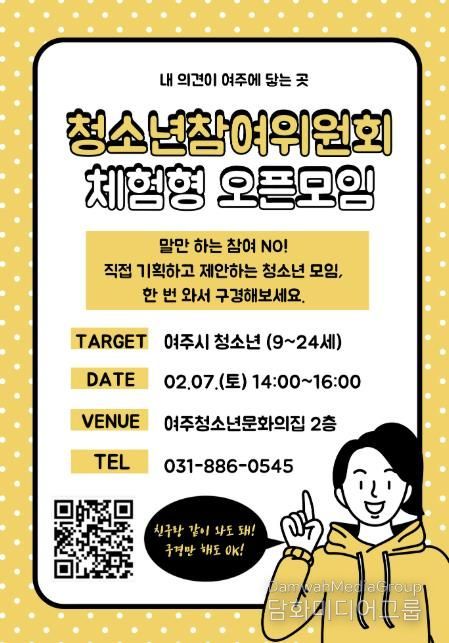 체험형 오픈모임은 2월 7일 오후 2시부터 4시까지 여주청소년문화의집 2층 청소년활동실에서 진행되며, 청참위 정기모임을 참관하고 활동 내용을 살펴볼 수 있다. 참여자는 친구와 함께 방문하거나 구경만 해도 가능하며, 소정의 기념품과 간식도 제공된다.
