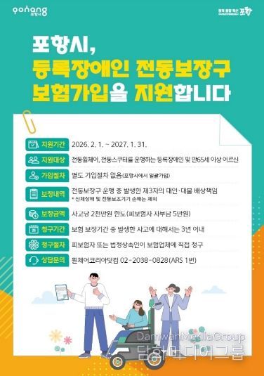 시민행정신문 기자 | 포항시는 장애인의 안전한 이동권 보장하고 사고 발생 시 경제적 부담을 덜어주기 위해 추진 중인 ‘장애인 전동보장구 배상책임보험 지원사업’을 2월부터 갱신 시행한다.
