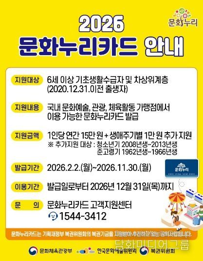 시민행정신문 강갑수 기자 | 광주문화재단(대표이사 직무대행 전은옥)은 2월 2일부터 6세 이상 기초생활수급자 및 차상위계층을 대상으로 2026년 문화누리카드 발급과 사용이 가능하다고 밝혔다.