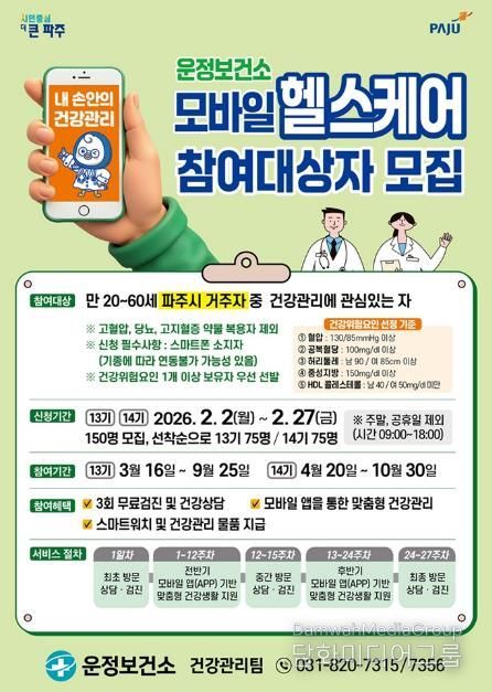 시민행정신문 기자 | 파주시 운정보건소는 시민의 자가 건강관리 능력 향상과 만성질환 예방을 위해 2026년 ‘모바일 헬스케어 사업’참여자를 모집한다.