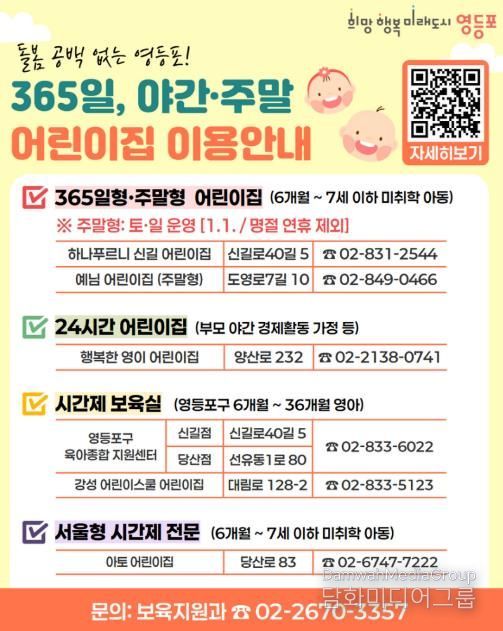 또한 구는 ‘24시간 어린이집’을 함께 운영하고 있다. 영등포동에 위치한 행복한 영이 어린이집은 오전 7시 30분부터 다음 날 오전 7시 30분까지 보육 서비스를 제공하며, 불가피하게 기존 보육시간 내 귀가가 어려운 아동을 대상으로 주간 보육과 야간 보육을 함께 지원한다.