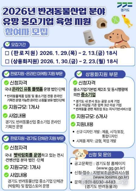 시민행정신문 강갑수 기자 | 경기도가 ‘반려동물산업 분야 유망 중소기업 육성 지원사업’ 참여 보조사업자를 모집한다.