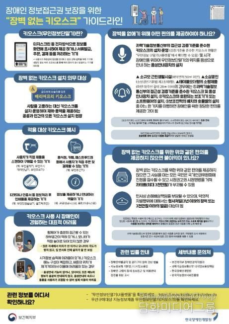 최근 개정된 ‘장애인차별금지 및 권리구제 등에 관한 법률’ 시행령에 따라, 공공과 민간에서 키오스크(무인정보단말기)를 설치·운영하는 경우 접근성 검증 기준을 충족하는 기기를 사용하고, 시각장애인을 위한 음성 안내 장치를 갖춰야 한다.