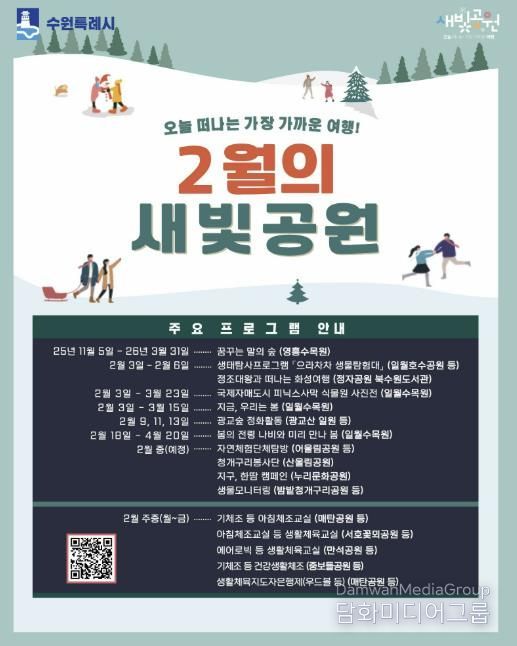 수원시 관계자는 “겨울철에도 시민들이 공원을 찾으며 자연과 교감하고 건강한 여가를 즐길 수 있도록 다양한 프로그램을 마련했다”며 “공원이 일상에서 더 친근한 생활 공간으로 자리 잡을 수 있도록 지속해서 노력하겠다”고 말했다.