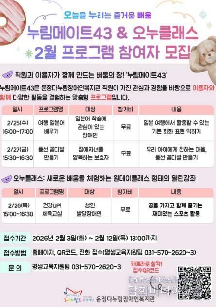 시민행정신문 강갑수 기자 | 파주시 운정다누림장애인복지관은 참여형 평생학습 프로그램 ‘누림메이트43’을 운영하며, 정규 강좌로는 담기 어려운 소규모 학습 수요를 반영한 생활 밀착형 배움을 실천하고 있다.