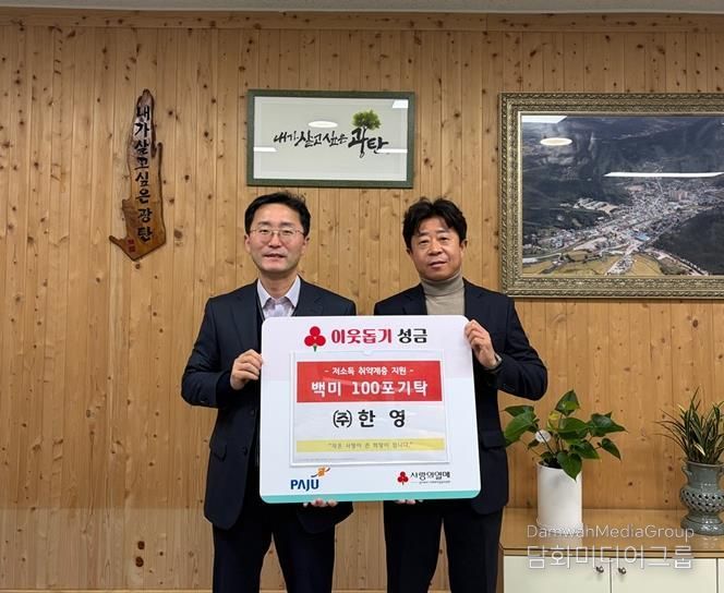 이재욱 광탄면장은 “㈜한영과 같이 지역사회에서 이웃들을 위해 따뜻한 손길을 전해주고 있는 든든한 이웃이 있어서 감사하다”라며 “지속적인 기부 활동이 주민들에게 큰 힘이 되고 있다”라고 전했다.