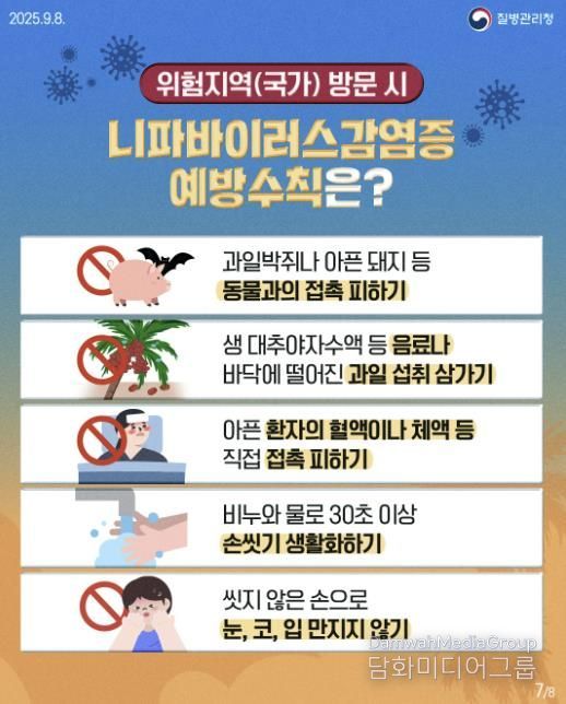 지난달 30일 질병관리청 발표에 따르면, 인도 서벵골주에서 니파바이러스감염증 환자 2명이 발생했으며, 이들과 접촉한 196명은 검사 결과 모두 음성으로 확인됐다. 현재까지 추가적인 감염 사례는 보고되지 않았다.