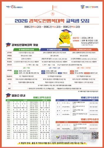 김호정 선비인재양성과장은 “경북도민행복대학은 시민들이 새로운 배움과 공동체 활동을 통해 인생 2막을 설계할 수 있는 소중한 기회”라며 “시민 여러분의 많은 관심과 참여를 바란다”고 말했다.