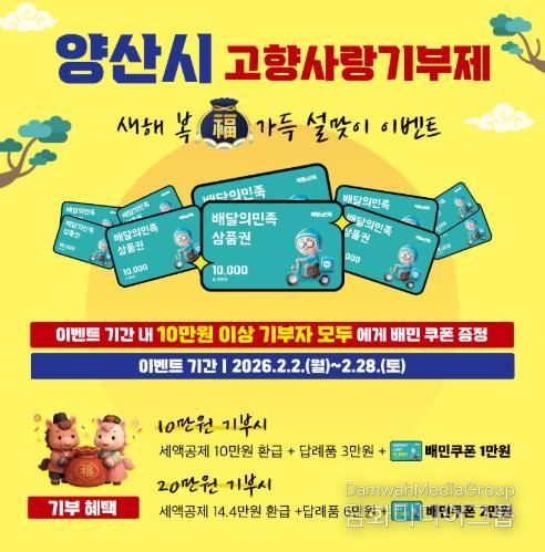 시민행정신문 강갑수 기자 | 양산시는 설 명절을 맞아 고향사랑기부제 참여를 활성화하기 위해 '새해 복(福) 가득 설맞이 이벤트'를 2월 2일부터 2월 28일까지 실시한다고 밝혔다.
