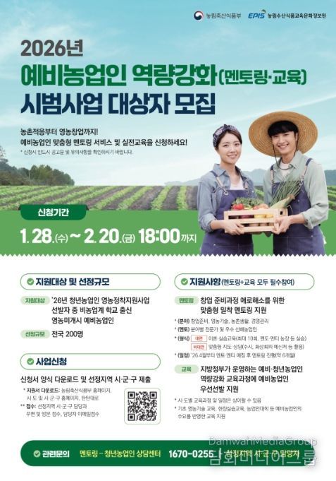모집 대상은 2026년 청년농업인 영농정착지원사업 선정자 중 농업계 고등학교를 졸업하지 않았거나, 아직 영농을 시작하지 않은 예비농업인이며, 전국 200명 중 경남에서는 22명을 선발한다.