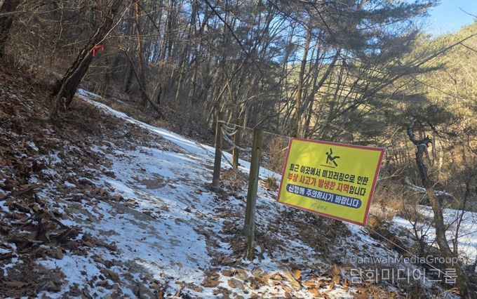 군은 십이폭포 중 운옥폭포(제9폭포)에 미끄럼 주의 현수막을 설치했다.