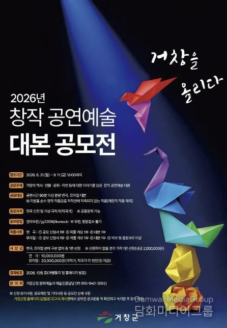 박도혜 문화예술과장은 “이번 공모전으로 거창의 이야기가 무대 위에서 새롭게 조명되는 계기가 되길 바란다”며 “지역 고유의 이야기가 창작자들의 상상력을 만나 완성도 높은 공연콘텐츠로 이어질 수 있도록 많은 관심과 참여를 기대한다”고 말했다.