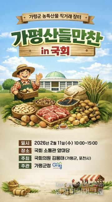 가평군은 오는 11일 오전 10시부터 오후 3시까지 국회 소통관 앞마당에서 ‘가평산들만찬마켓 in 국회’ 농특산물 직거래 장터를 개최한다고 밝혔다. 이번 행사는 김용태 국회의원실이 주최하고 가평군이 주관한다.