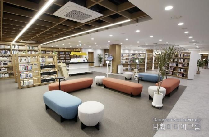 특히, 기존의 높은 밀집 서가로 인해 좁고 어두운 공간을 개방형의 낮은 서가와 세련된 테이블·소파 등을 배치해 개선하고, 여기에 격자 천장·조명 시공을 더해 밝고 현대적인 분위기의 도서관으로 탈바꿈시켰다.