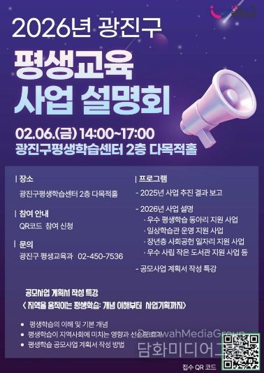 시민행정신문 강갑수 기자 | 광진구가 오는 2월 6일 오후 2시 광진구 평생학습센터(자양로15길 60)에서 ‘2026년 광진구 평생교육사업 설명회’를 개최한다.