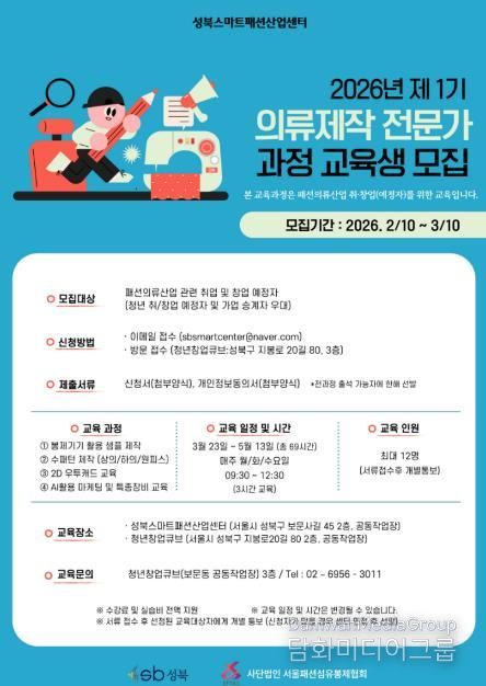 시민행정신문 강갑수 기자 | 서울 성북구가 (사)서울패션섬유봉제협회에 위탁 운영 중인 성북스마트패션산업센터에서 2026년 제1기 의류제작 전문가과정 교육생을 모집한다.