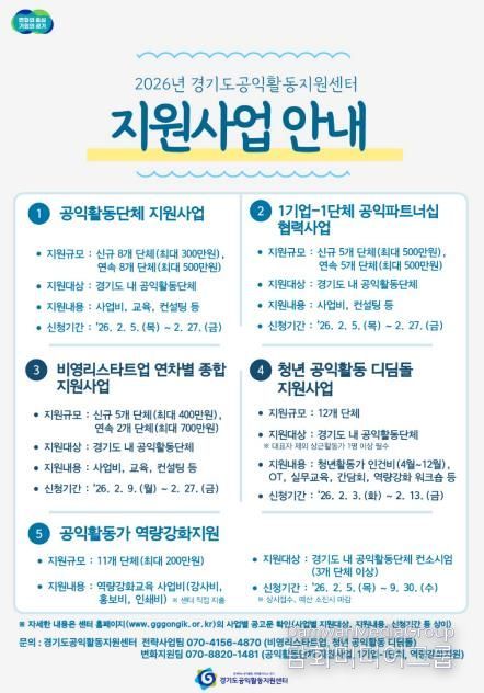 유명화 경기도공익활동지원센터장은 “이번 모집을 통해 공익활동의 현장 기반을 강화하고, 다양한 주체들이 지역사회 문제 해결에 적극 참여하길 기대한다”고 말했다.