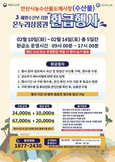 이번 행사는 안산시농수산물도매시장 수산동에서 진행되며, 행사 기간 중 국산수산물을 구매한 소비자에게 구입 금액의 최대 30%를 온누리상품권으로 환급해 주는 방식으로 운영된다.