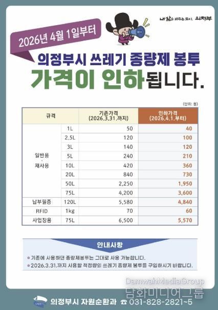 조 의원은 “지난 6개월 넘게 추진해 온 종량제 봉투 가격 인하가 지난해 12월 22일 '의정부시 폐기물 관리 조례' 수정 가결로 결실을 맺었다”며, 오는 4월 1일부터 새로운 가격이 시행될 예정이라고 전했다.