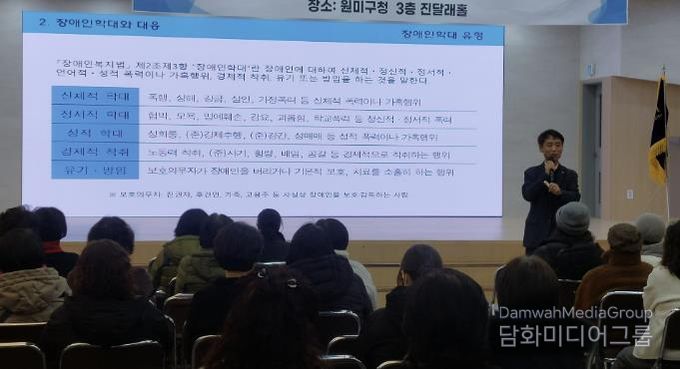 이날 교육은 곽병권 부천시장애인인권센터장이 강사로 나서 장애와 인권, 장애인 학대 및 대응 방법, 장애 유형별 소통과 지원, 인권센터 대응 사례, 활동지원사 신고 사례 등을 중심으로 진행됐다.