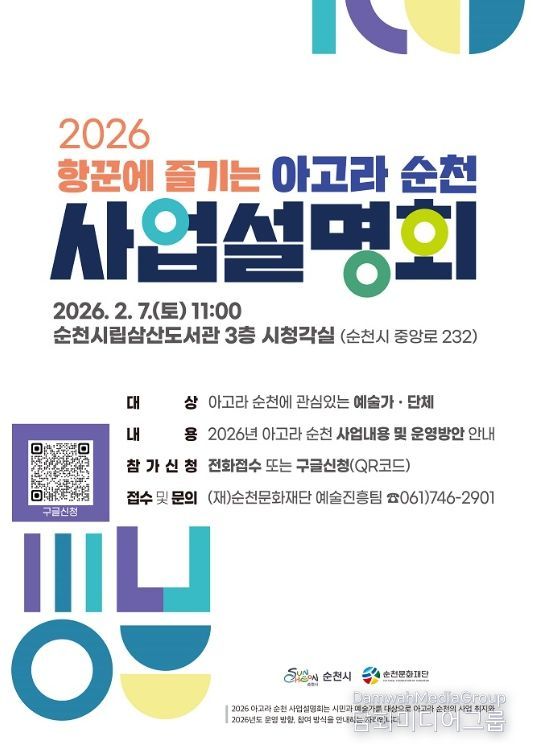 시민행정신문 강갑수 기자 | (재)순천문화재단은 오는 7일 11시, 순천삼산시립도서관 시청각실에서 지역예술인과 시민을 대상으로 ‘2026 항꾼에 즐기는 아고라 순천’ 사업설명회를 개최한다.