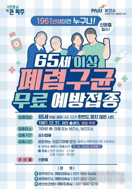 시민행정신문 기자 | 파주시는 고령층의 건강한 노후와 감염병 예방을 위해 65세 이상 시민을 대상으로 폐렴구균 예방접종을 연중 무료로 지원하고 있다고 밝혔다.