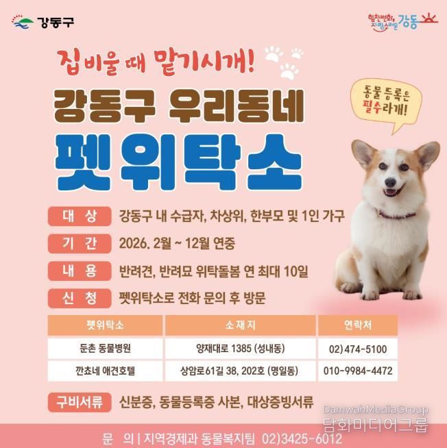 시민행정신문 강갑수 기자 | 서울 강동구는 설 명절을 맞아 장기간 외출하거나 입원해야 하는 상황에서 반려동물 돌봄 여건이 어려운 주민을 지원하기 위해, 2월부터 ‘우리동네 펫위탁소’를 연중 상시 운영한다고 밝혔다.