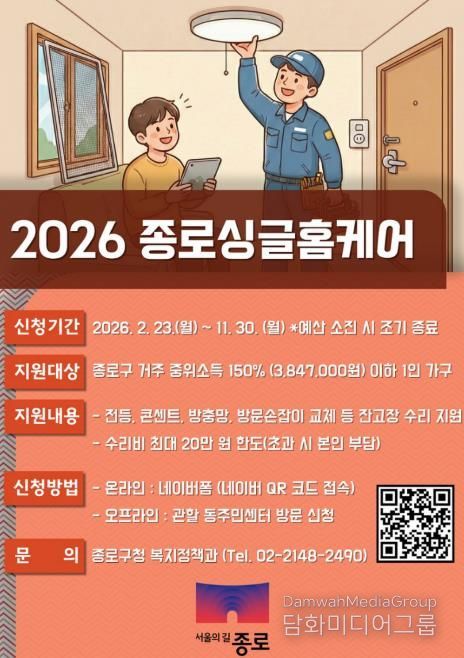 종로 싱글홈케어는 2023년 시작한 대표적인 1인가구 맞춤형 복지 정책으로, 혼자서는 처리하기 어려운 전등·수도 교체 등을 전문 수리기사가 직접 방문해 해결해 주는 현장 중심 서비스다.