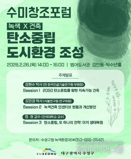 시민행정신문 김학영 기자 | 대구 수성구는 이달 26일 ‘녹색×건축: 탄소중립 도시환경 조성’을 주제로 범어도서관 김만용·박수년홀에서 ‘수미창조 포럼’을 개최한다고 밝혔다.
