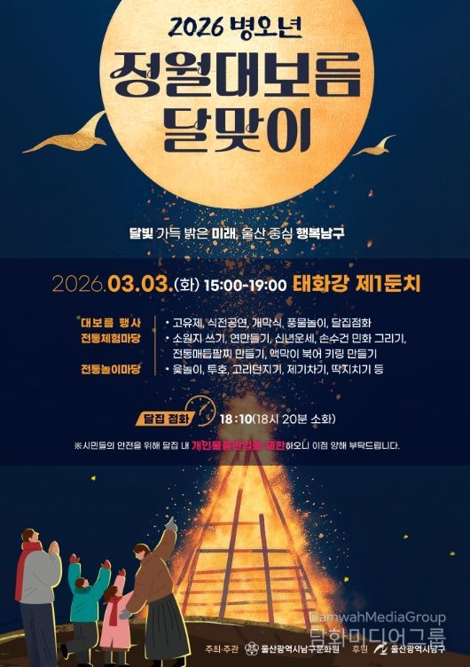 시민행정신문 강갑수 기자 | 울산 남구는 정월대보름을 맞아 오는 3월 3일 오후 3시부터 태화강 제1둔치에서 전통 세시풍속을 계승하고 한 해의 안녕과 풍요를 기원하는 정월대보름 행사를 개최한다고 밝혔다.