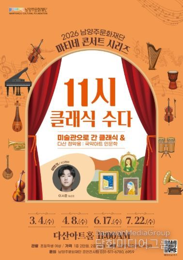 한편, 2026 남양주문화재단 마티네 콘서트는 초등학생 이상 관람 가능하며, 공연별 티켓 오픈 일정 및 자세한 내용은 남양주문화재단과 남양주시 누리집을 통해 확인할 수 있다.
