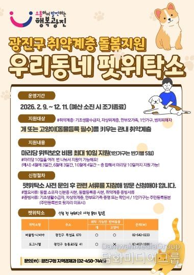 시민행정신문 강갑수 기자 | 광진구가 갑작스러운 상황으로 인해 반려동물 임시보호가 필요한 취약계층을 위해 ‘우리동네 펫위탁소’를 운영한다.