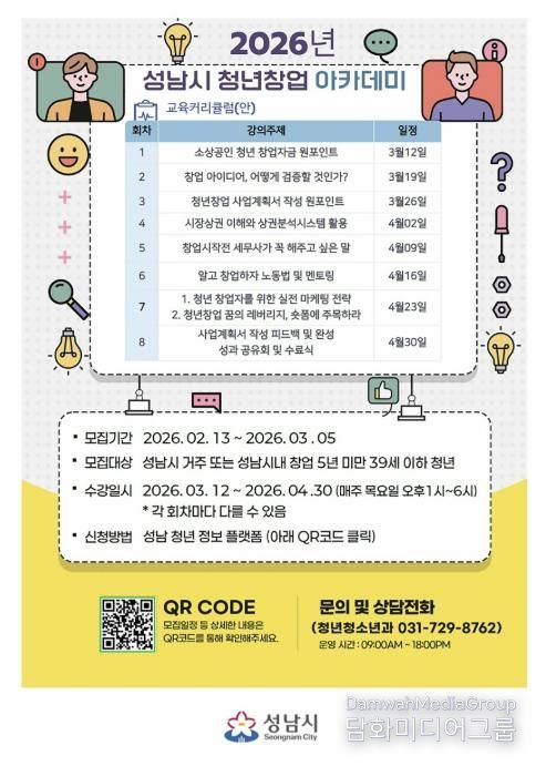 시민행정신문 강갑수 기자 | 성남시는 오는 3월 5일까지 ‘청년창업 아카데미’ 무료 교육생 30명을 모집한다.