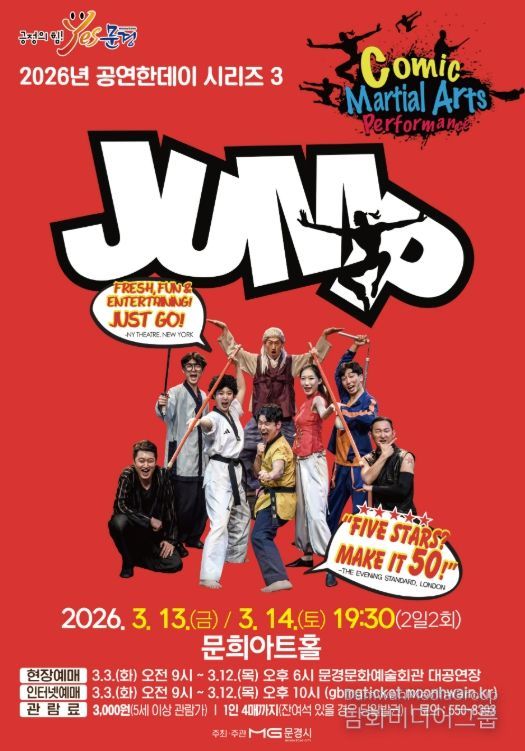 시민행정신문 강갑수 기자 | 문경문화예술회관에서는 화려한 공중회전을 선보이는 아크로바틱과 고난이도 동양 무예, 슬랩스틱 코미디가 어우러진 넌버벌 퍼포먼스 점프(JUMP) 공연을 3월 13일 19:30, 14일 19:30 (2일 2회)에 문희아트홀에서 개최한다.